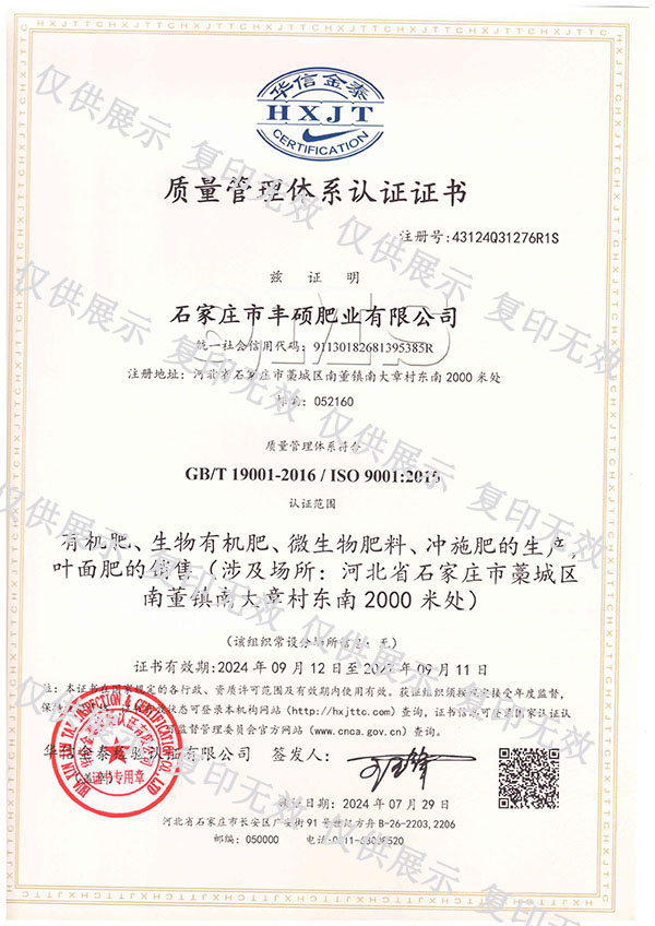 石家莊市豐碩肥業(yè)有限公司是一家集新型肥料的研發(fā)、制造、營銷、服務(wù)于一體的高新技術(shù)企業(yè),公司自2008年創(chuàng)辦以來,一直致力于新型肥料的技術(shù)研發(fā)和市場推廣。公司組建了豐碩新型肥料研究中心(院士專家企業(yè)工作站),自主知識產(chǎn)權(quán)研發(fā)團(tuán)隊(duì)專業(yè)科研人員20余人,獲得了多項(xiàng)肥料國家發(fā)明專利。公司目前已擁有發(fā)酵類有機(jī)肥、微生物菌劑、生物有機(jī)肥、土壤調(diào)理劑、大量元素水溶肥、含腐植酸肥料、含氨基酸肥料、中微量元素肥料等8大品類,“金維克”、“豐碩沃農(nóng)”等2大自有品牌,擁有20多個(gè)暢銷品種。目前,我公司已經(jīng)通過了“ISO9001 質(zhì)量管理體系認(rèn)證”、“ISO14001 環(huán)境管理體系認(rèn)證”、“OHSAS18001 職業(yè)健康管理體系認(rèn)證”。...